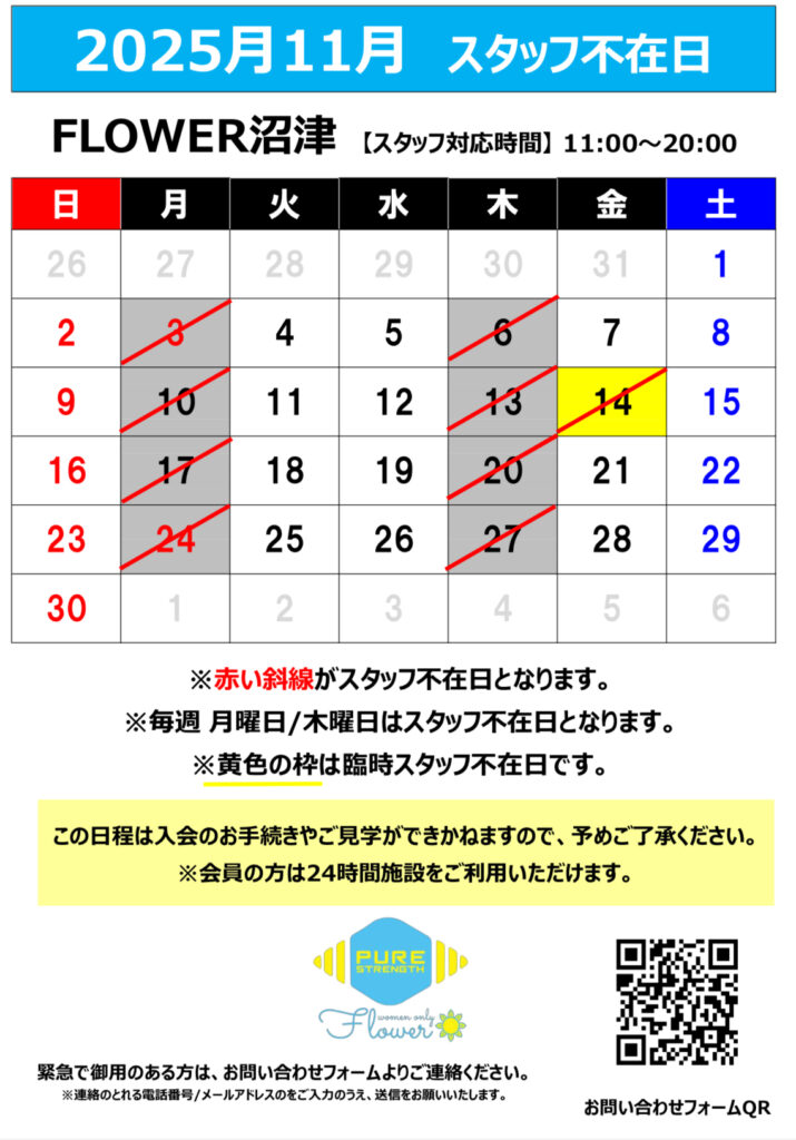 スタッフ不在日はお手続きやビジター利用ができかねますので、ご了承ください。※会員様は24時間施設をご利用いただけます。