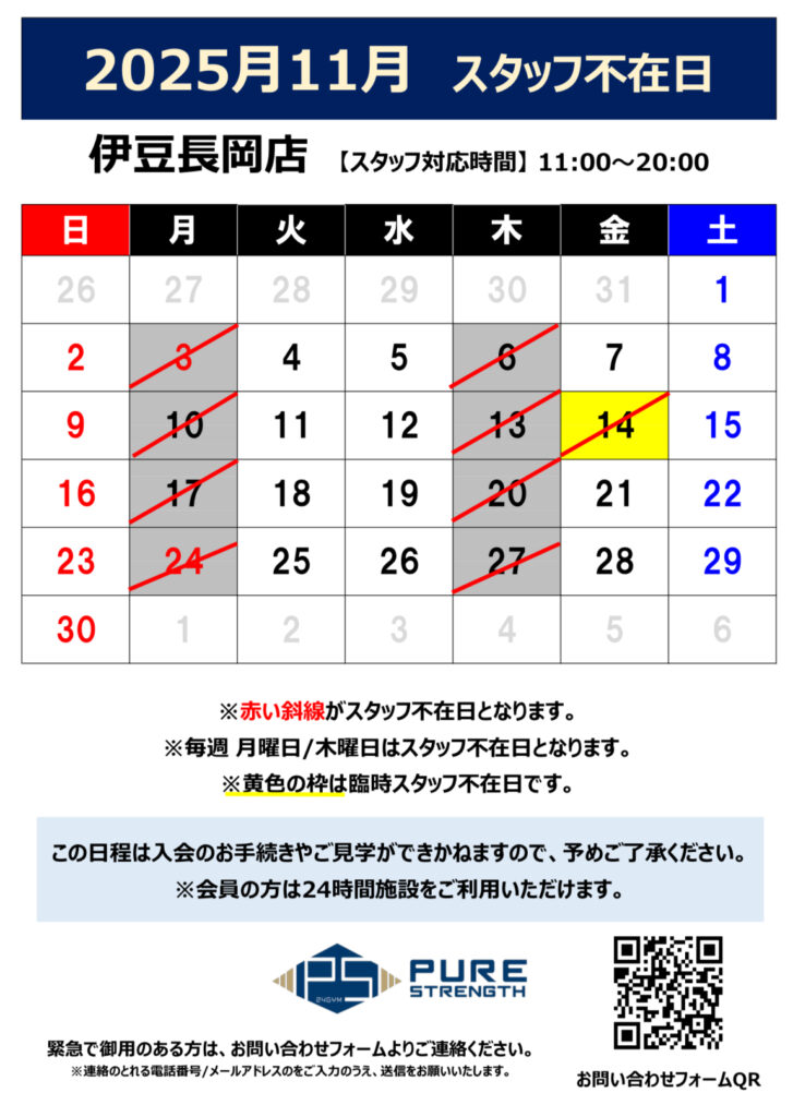 スタッフ不在日はお手続きやビジター利用ができかねますので、ご了承ください。※会員様は24時間施設をご利用いただけます。