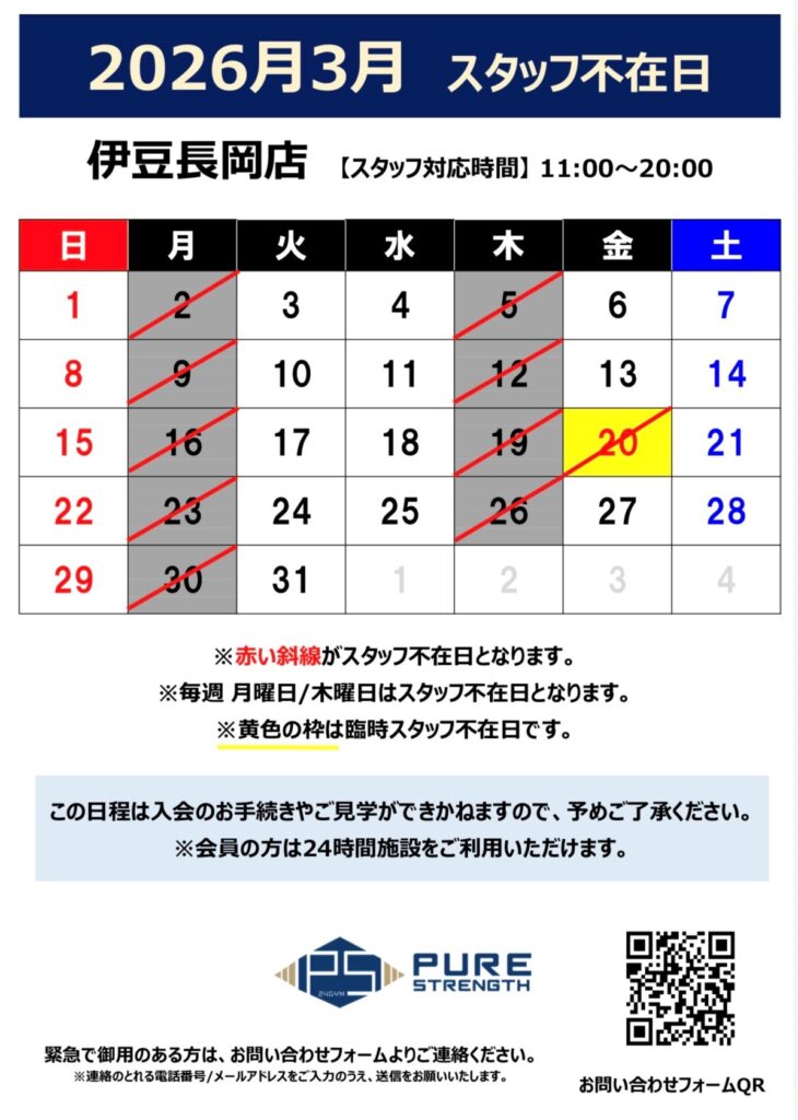 2026年3月のスタッフ不在日です。スタッフ対応時間 11:00~20:00※毎週月曜/木曜はスタッフ不在日となります。