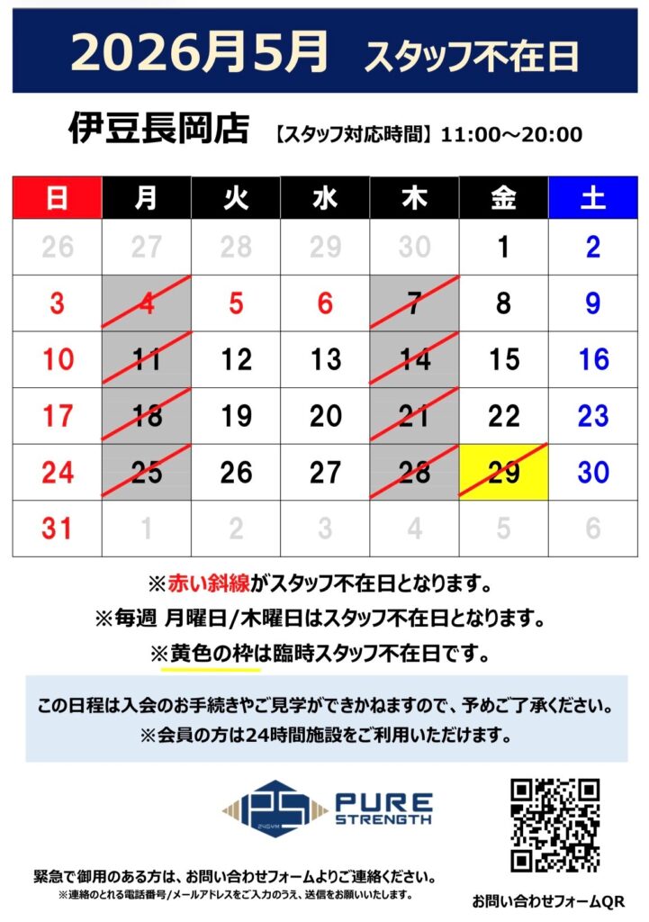 2026年5月のスタッフ不在日です。スタッフ対応時間 11:00~20:00※毎週月曜/木曜はスタッフ不在日となります。